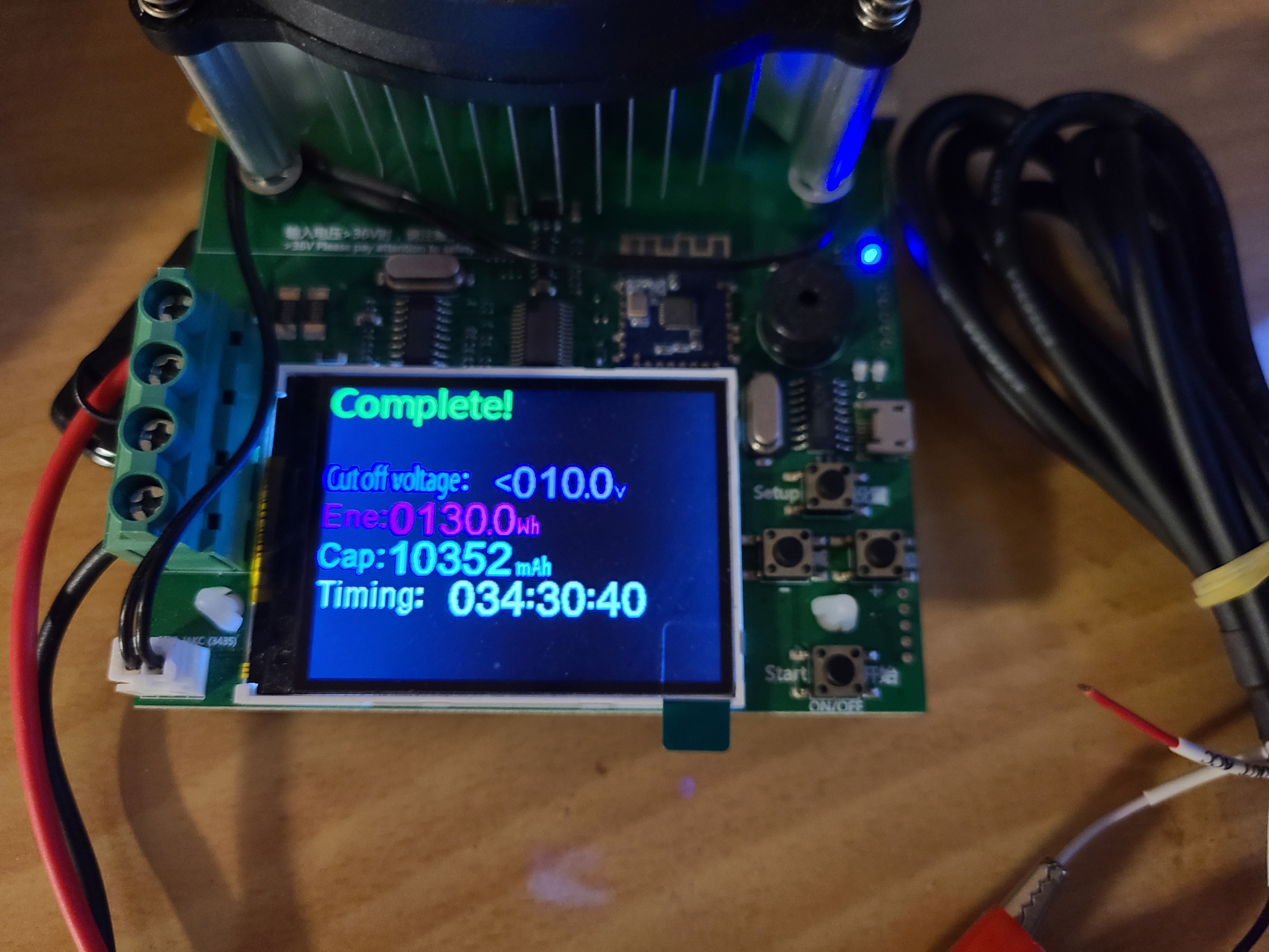 위 사진에서 보듯이 약 34시간 30분 정도 경과한 후에 130wh, 10352mAh의 용량으로 측정되었습니다. SP15000 배터리의 용량은 12000mAh입니다. 신품대비 약 86%인 것으로 예상합니다. 셀 밸런싱도 맞추지 않은 상태에서 배터리 용량이 신품 대비 80% 이상이면 양호한 것으로 생각합니다.