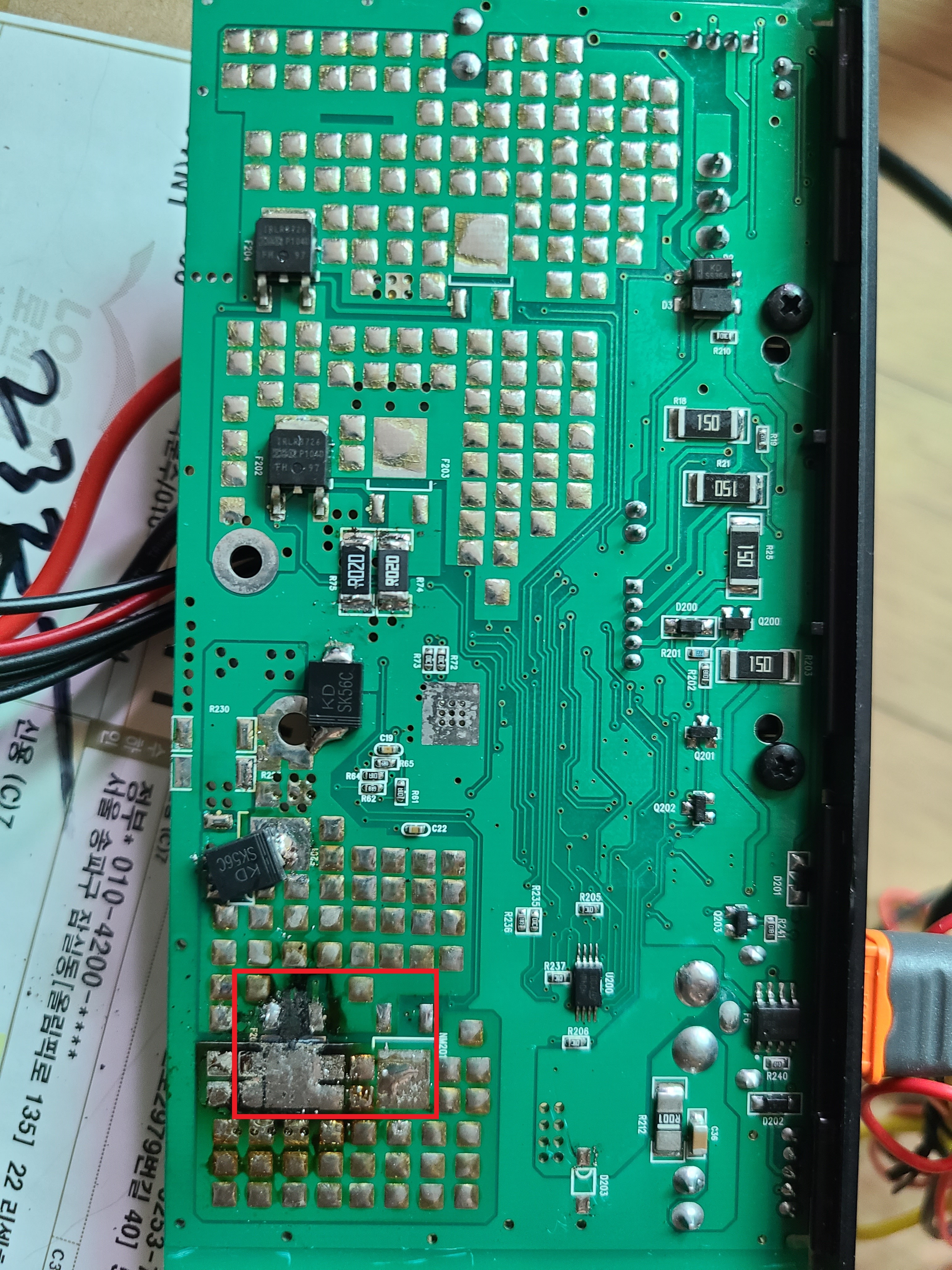 아래쪽 검게 그을린 부분이 눈에 확 들어옵니다. IRLR8726인데 N-Channel MOSFET입니다. IRLR8726이 총 4개인데, 검게 그을린 아래쪽에 있는 두 개는 출력을 담당하고, 위에 있는 두 개는 입력을 담당하는 것 같습니다.