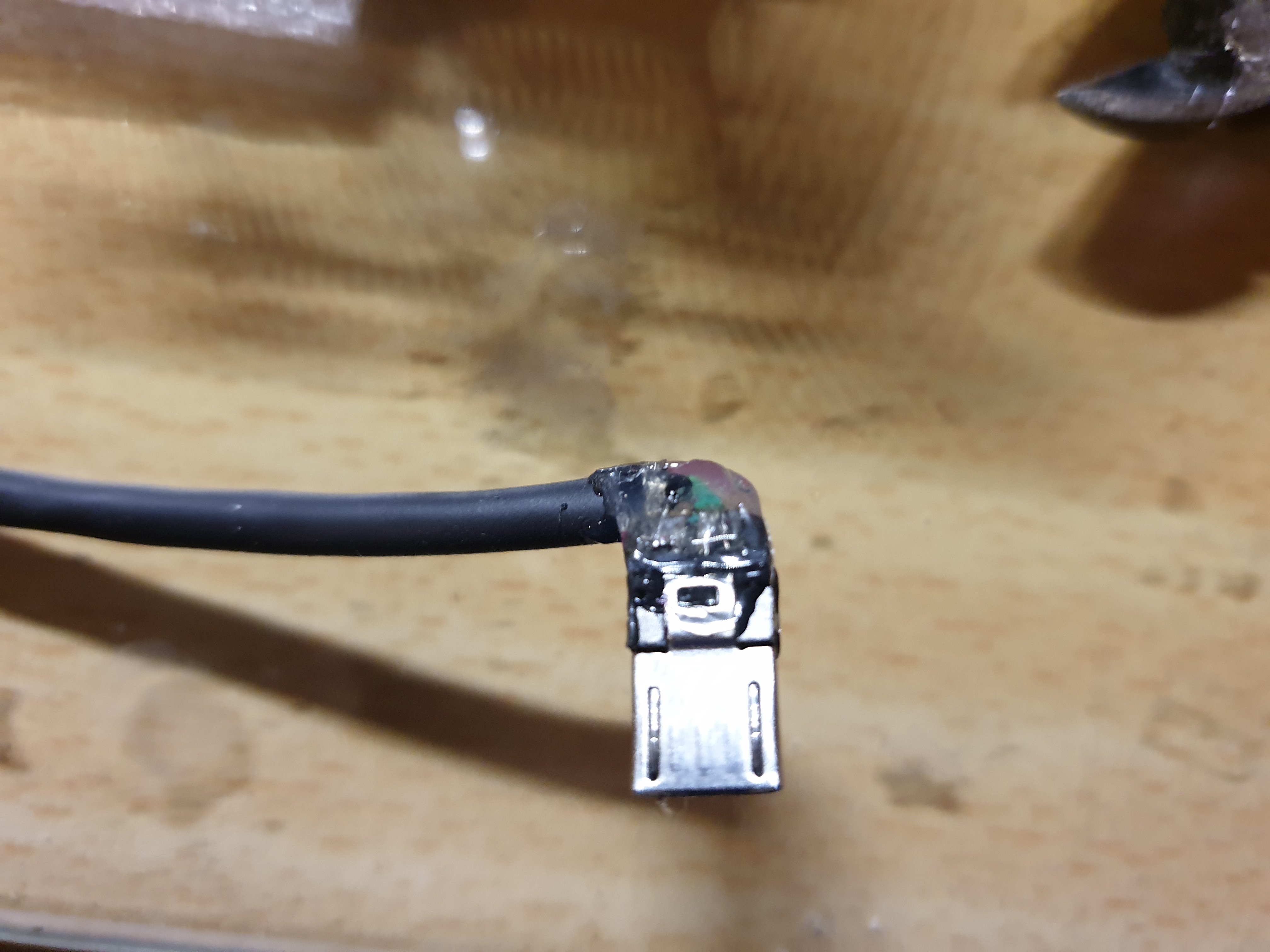 사진 찍을 생각을 못하고 마감했습니다. 원래는 3핀만 연결하면 되는데 혹시 몰라서 5핀을 모두 다 연결했습니다. 1번 핀은 빨간 선(5V), 2번 핀은 녹색 선(data-), 3번 핀은 흰색 선(Data+), 4번 핀은 흑색 선(ID), 5번 핀은 shield 선(Gnd). 이렇게 연결했습니다. 원래는 2번 핀이 희색 선, 3번 핀이 녹색 선이어야 하는데, 만들다가 착각해서 두 선이 바뀌는 실수를 범했습니다. 또, USB 5개 선이 다 있는 선을 찾지 못해서 궁여지책으로 shield 선을 사용하기로 했습니다.