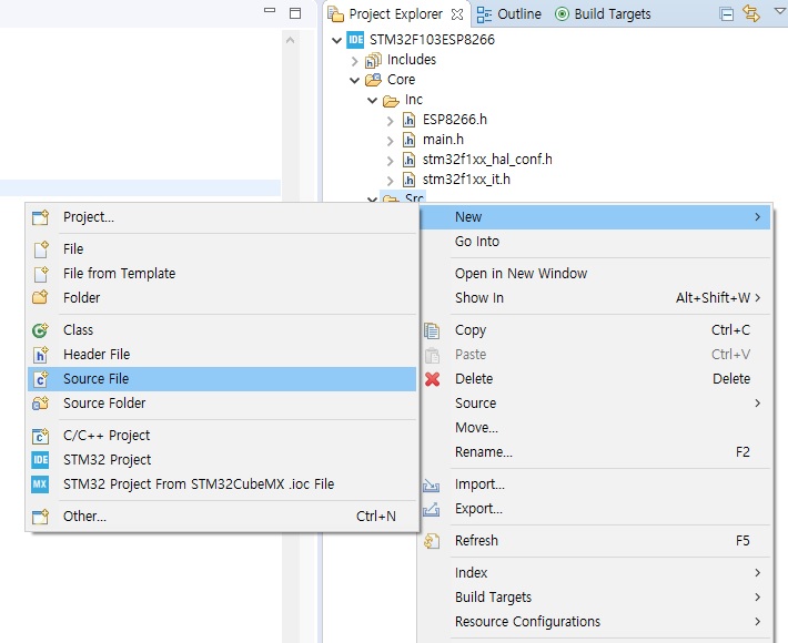 ⑬ 다음 그림에서와 같이 [Project Explorer]의 [Src]를 오른쪽 바우스 버튼으로 클릭하여 [New], [Source File]을 순서대로 선택한 후에 [ESP8266.cpp] 파일을 추가합니다.
