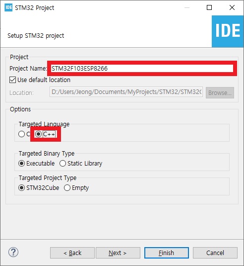 ③ 프로젝트 이름을 입력합니다. 프로젝트의 이름을 STM32F103ESP8266으로 입력했고, c++로 프로그래밍할 것이므로 Targeted Language를 C++로 서선택했습니다. 여기서 C++로 선택했음에도 불구하고 실제 만들어진 프로젝트는 c로 만들어집니다. C++로 프로그래밍하려면 확장자가 c인 파일들을 수동으로 cpp로 바꾸어 주어야 합니다.