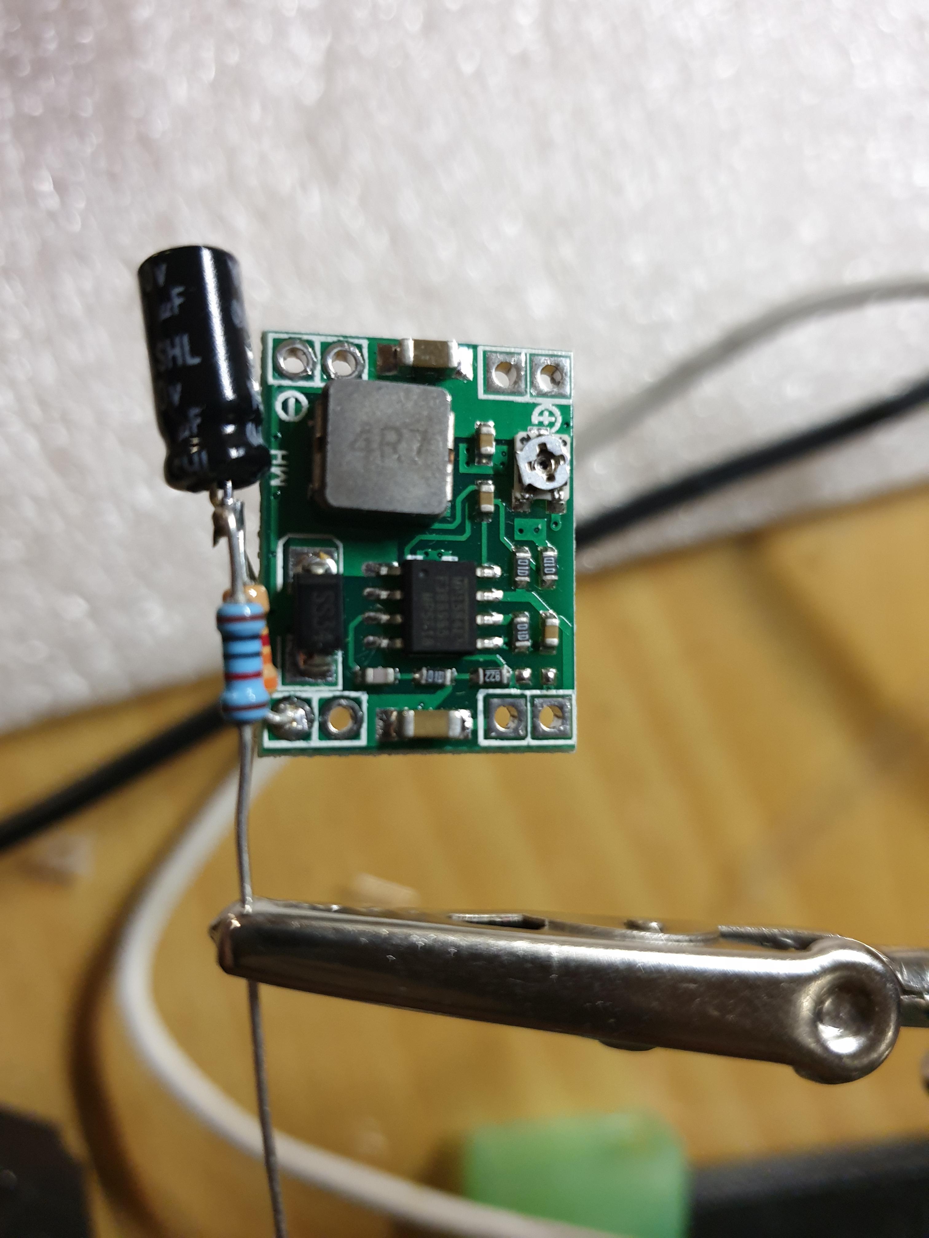 ACC 전원이 12V이므로 그대로 A800의 ID핀에 입력하면 A800이 순식간에 연기에 싸이면서 사망할 것입니다. ACC 전원을 12V에서 5V로 낮추어 입력해야 합니다. 이 작업을 하기 위해 위의 모듈을 하나 더 사용해도 되지만, 더욱 저렴하고 간단하게 저항 두 개로 해결하기로 합니다. V = I x R 공식을 이용해서, 10k옴 저항 1개, 3.3k옴 저항 1개를 사용했습니다. 10k옴과 3.3k옴을 연결한 곳에서 A800의 ID 신호(USB 선 4번 핀,흑색선)를 가져갑니다. 이 신호가 순간적으로 5V 이상의 전압이 걸리는 것을 방지하기 위해서 1uF의 전해 콘덴서를 추가했습니다. 다음 사진은 위의 step down converter에 ACC 전원용 부품들을 붙여 놓은 것입니다.