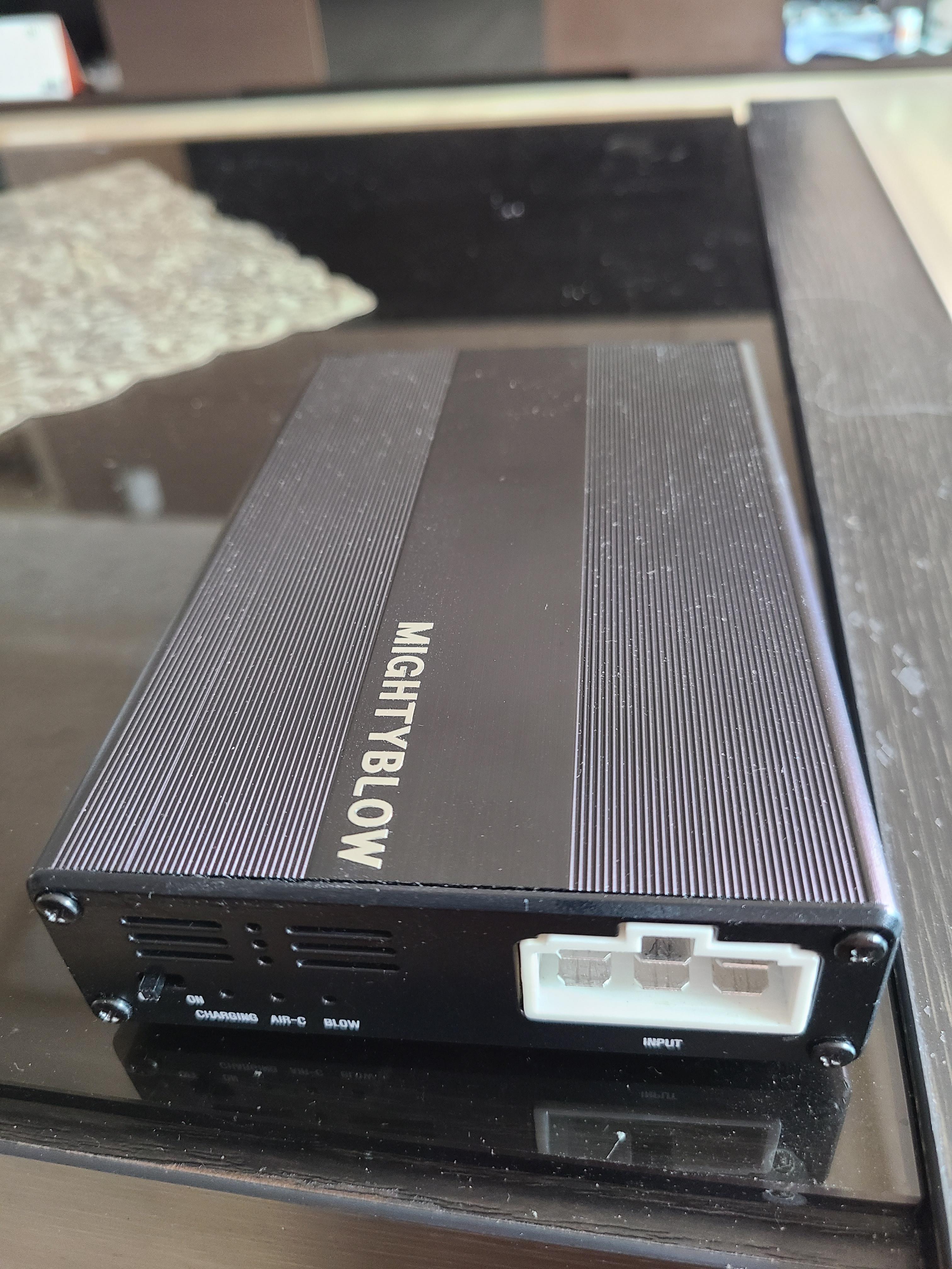 전면에 On/Off 스위치, CHARGING, AIR-C, BLOW 상태를 표시하는 led 3개, 차량과 연결하는 INPUT 6핀 커넥터가 있습니다.