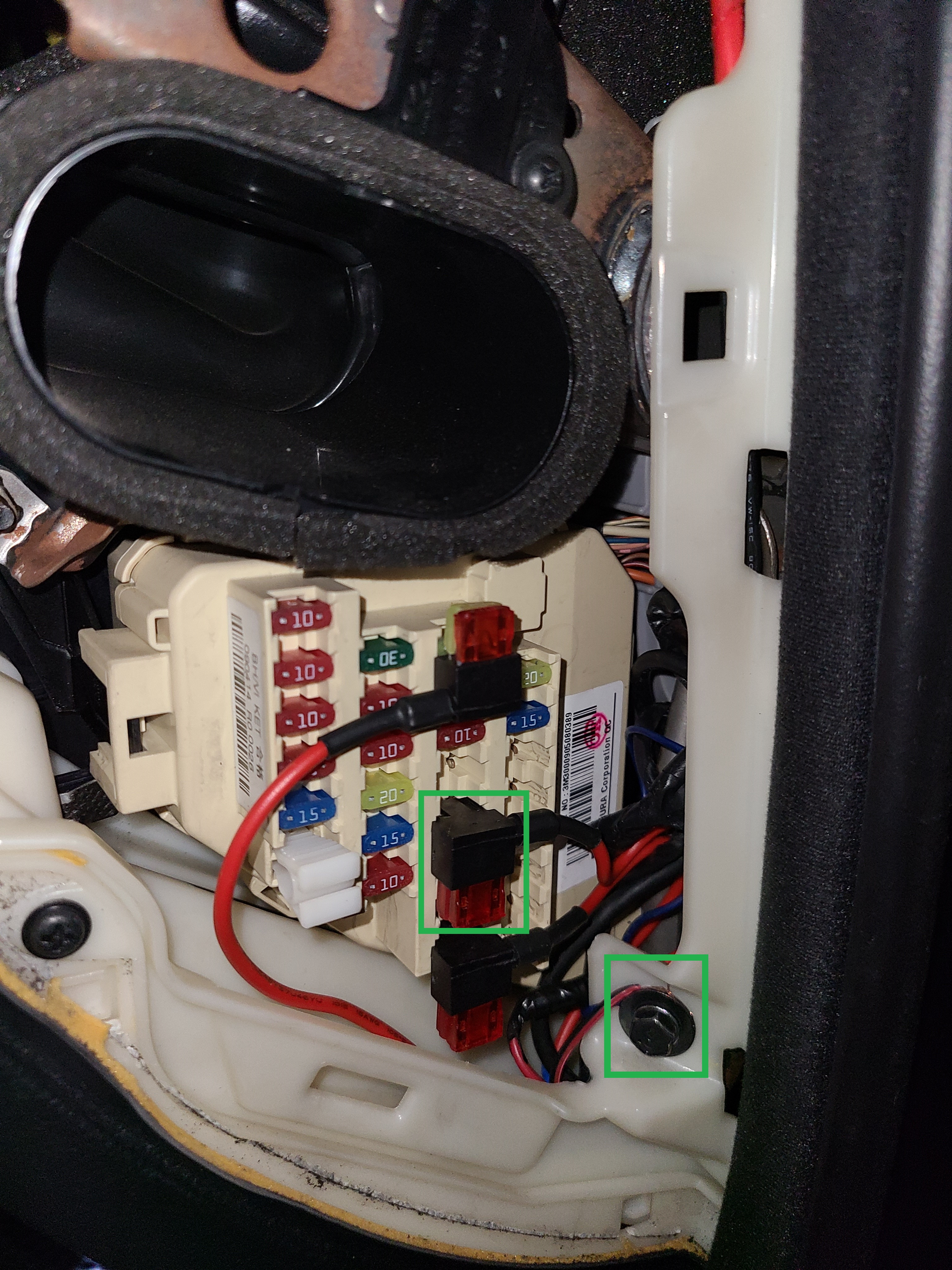 MBW1000의 INPUT ①번 핀은 위 사진의 녹색으로 표시한 휴즈 확장선의 위치에 있는 앞 열 시거잭의 휴즈에 병렬 연결했습니다. 이 위치에는 왼쪽의 핀이 배터리와 연결되기 때문에 휴즈 확장선은 반드시 위 사진과 같은 방향으로 연결해야 합니다. 녹색으로 표시한 나사는 차체와 연결되어 있습니다. 예전에 CABUS 설치하면서 차량 프레임에 연결되어 있다는 것을 확인했습니다. MBW1000의 INPUT ④번 핀을 이 볼트에 연결합니다.