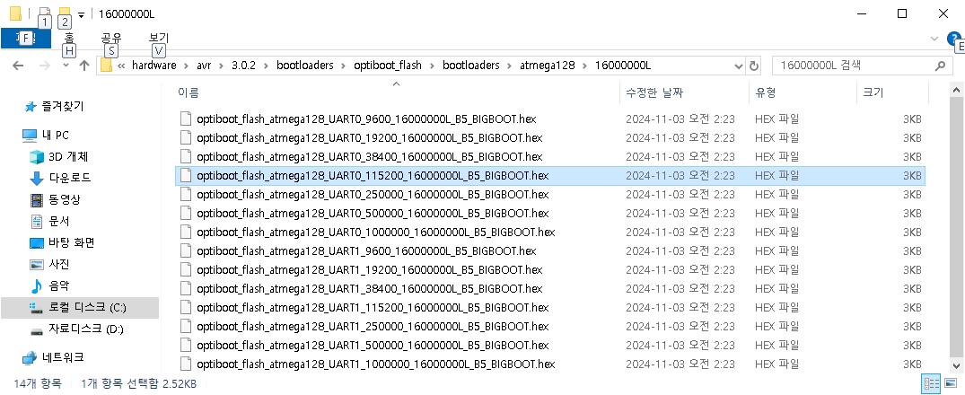 위 폴더에 있는 여러 개의 부트로더 중에서 optiboot_flash_atmega128_UART0_115200_16000000L_B5_BIGBOOT.hex 파일을 선택합니다. 파일명으로 짐작하건대 UART0bps를 이용해서 115200bps의 속도로 통신하는 부트로더입니다.