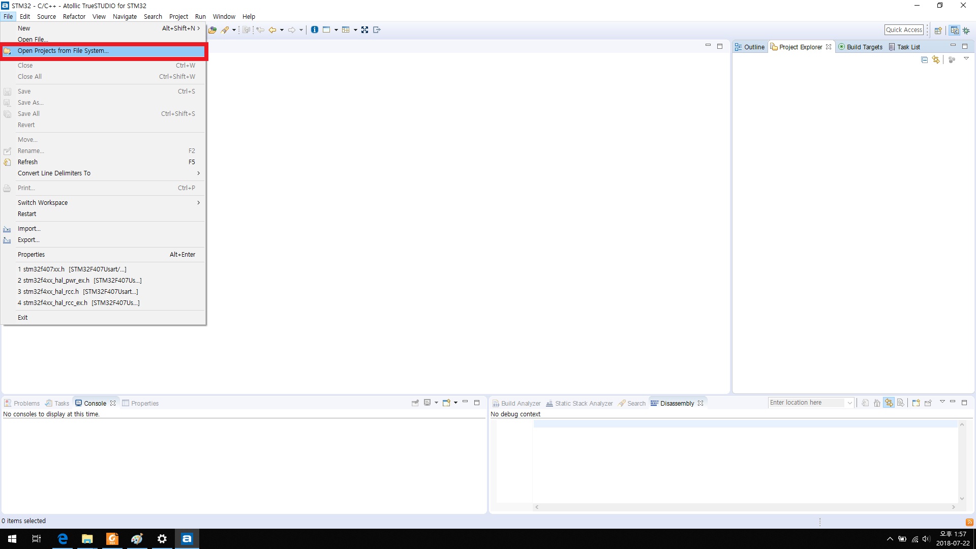 [Project] 메뉴에서 [Build Project]를 클릭하여 실행파일을 만듭니다.