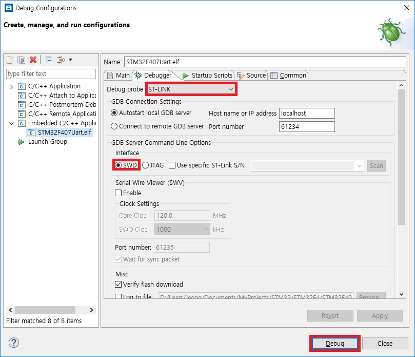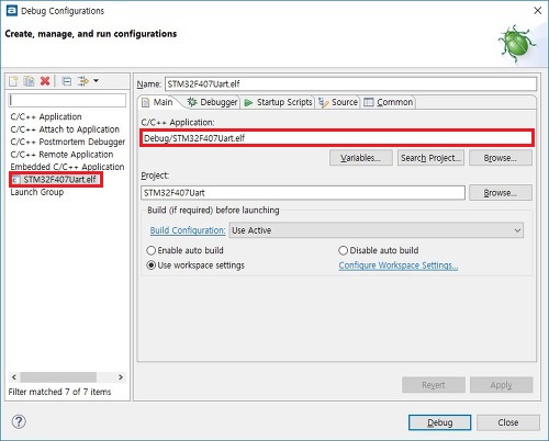 [Run] 메뉴에서 [Debug Configurations...]을 클릭하여 다음의 그림과 같이 설정한 후에, 맨 아래의 [Debug] 버튼을 누릅니다. [Debug] 버튼을 누르면 실행파일이 STM32F407로 다운로드 된 후에 디버깅 모드로 들어 갑니다. [Run] 메뉴의 [Terminate]를 클릭하거나 툴박스의 [Terminate] 아이콘을 누르면 디버그 모드가 종료됩니다. 이후로는 [Run] 메뉴의 [Debug]를 클릭하면 바로 다운로드 및 디버깅이 시작됩니다.