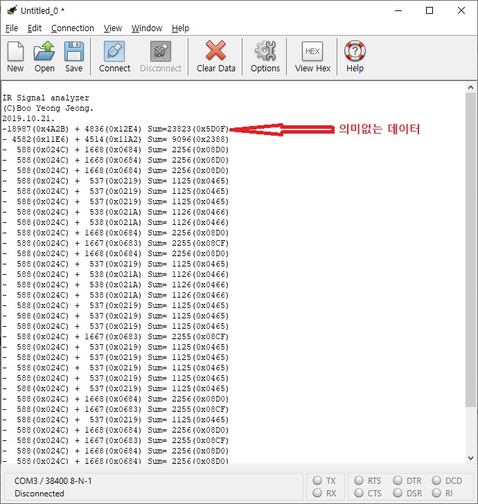IR 신호를 받아 측정한 결과 값을 출력하는 예입니다.'-' 기호 이후의 숫자는 low 상태의 길이(uS 단위)이고, '+' 기호 이후의 숫자는 high 상태의 길이(uS 단위)입니다. "Sum=" 뒤의 숫자는 low 상태의 길이와 high 상태의 길이를 합한 값입니다. 각 길이 뒤의 ()안의 수는 길이를 16진수로 표시한 것입니다. 앞에서 언급한대로 첫 데이터는 의미없는 값이므로 무시해야 합니다.