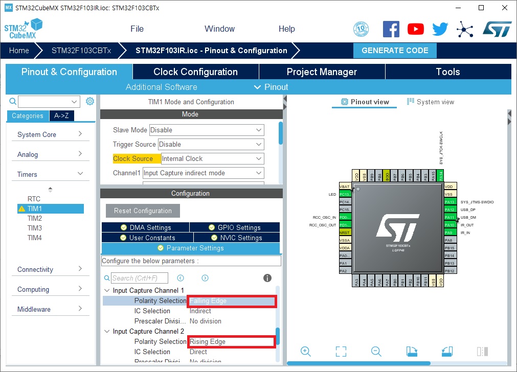 리모콘에서 high 신호가 나오기 시작할 때에 603LM의 출력은 low로 변화합니다. 이 때에 TIM1의 Channel1에 Input Capture가 발생하도록 설정했습니다. 마찬가지로 IR 신호가 low로 변할 때에 603LM의 출력이 high가 되면서, 이 때에 TIM1의 Channel2에 Input Capture가 발생하도록 설정했습니다.