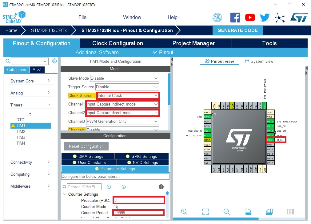 ④ Parameter Settings 항목에서 Prescaler를 8, Count Period를 29999로 입력합니다. Timer1이 9MHz로 동작하는데 prescaler에 8을 입력하면 Timer1은 9MHz / (8 + 1)의 속도로 동작합니다. 즉 Timer1은 1micro second(1uS)에 1씩 증가합니다. Counter Period에 29999를 입력해 놓으면 Timer1은 (29999 + 1) uS마다 overflow가 발생합니다. TIM1 update interrupt가 발생하도록 설정했다면 30000uS 즉 30 mili second(mS)마다 TIM1 update interrupt가 발생합니다. Input Capture가 발생하다가 30mS 동안 입력이 없으면 일단 Input Capture가 종료한 것으로 간주하기로 합니다.