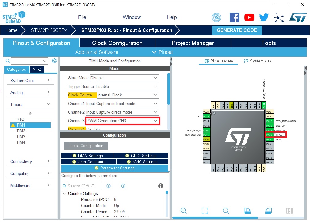 IR 신호를 송출할 때에는 약 38KHz로 IR LED를 On/Off 해야 합니다. 이때에 TIM1의 Channel3을 PWM으로 동작시킬 예정입니다. 다음 그림에서와 같이 TIM1의 Channel3를 PWM Generation CH3로 설정하고, PA10의 라벨을 IR_OUT으로 설정합니다.