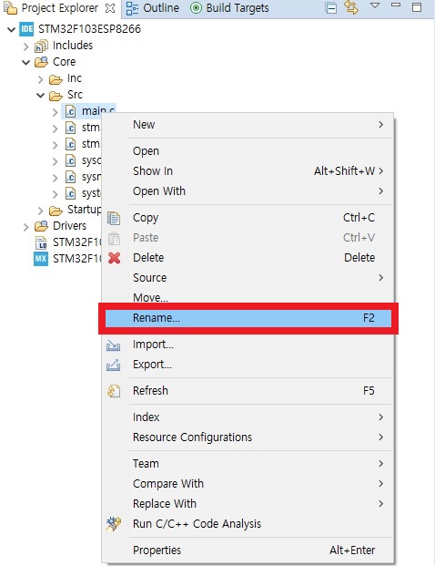 ⑪ ESP8266을 제어하는 루틴들을 클래스 ESP8266으로 만들어 사용할 예정입니다. main.c와 stm32fxx_it.c에서 클래스 ESP8266을 사용해야 합니다. 앞에서 잠시 언급한 바와 마찬가지로 소스 프로그램에서 C++ 요소인 클래스를 인식하려면 확장자를 c에서 cpp로 바꾸어 주어야 합니다. 아래 그림들과 같이 [Project Explorer]에서 파일명 main.c를 마우스 오른쪽 버튼으로 클릭하고, 팝업 메뉴에서 [Rename]을 선택해서 main.cpp로 이름을 바꾸어 줍니다. 같은 방법으로 stm32fxx_it.c를 stm32fxx_it.cpp로 바꾸어 줍니다.