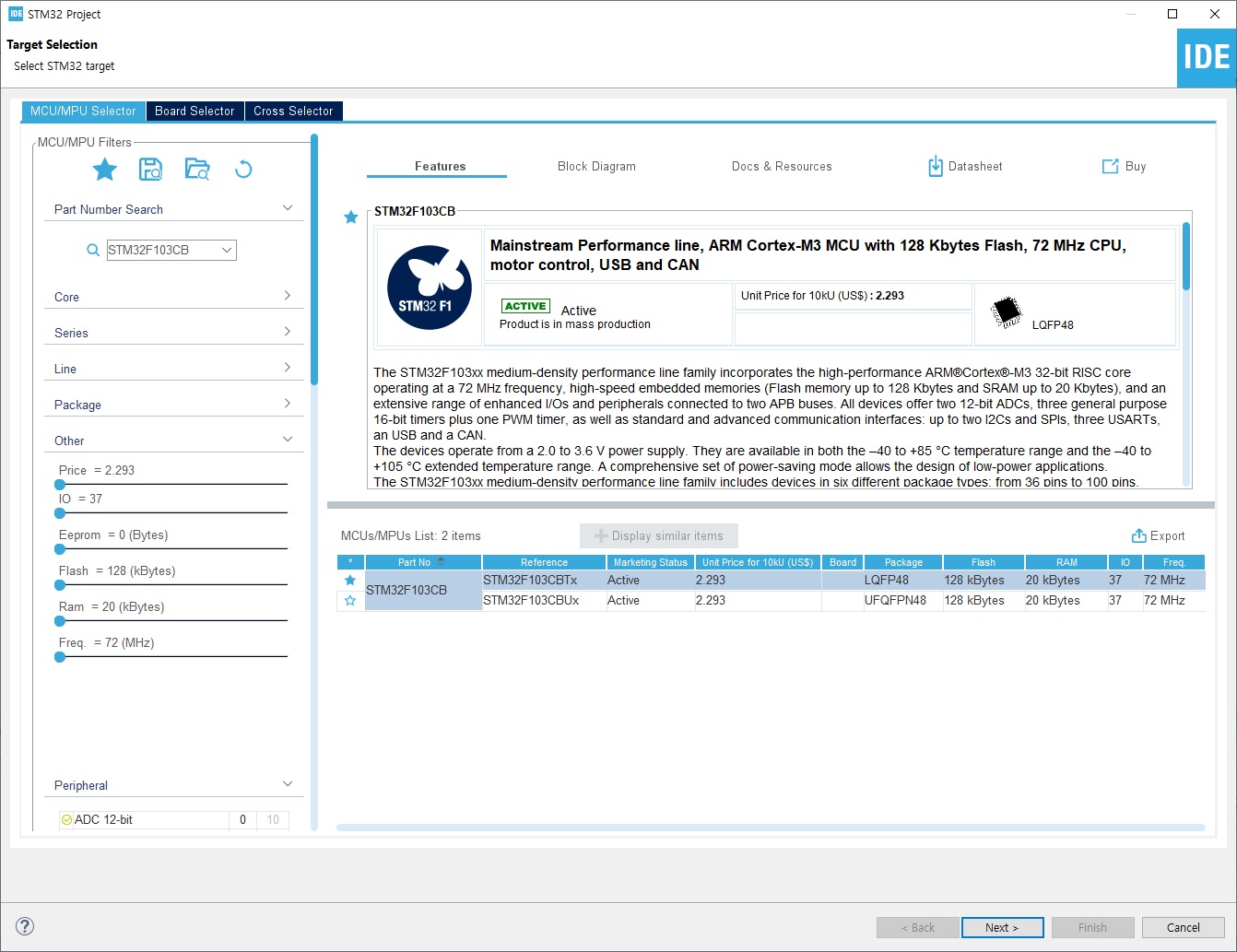 ② MCU를 선택합니다. 인터넷이 연결되어 있으면 CubeIDE가 자동으로 MCU 등과 관련된 필요한 정보를 업데이트합니다. 업데이트가 끝나면 MCU를 선택하는 화면이 나타납니다. 이글에서 사용하고 있는 blue pill 보드는 실제로는 STM32F103C8T6을 사용하고 있지만, 실제 사용할 수 있는 플래시 메모리가 128KB이므로 MCU로 STM32F103CBT6를 선택했습니다.
