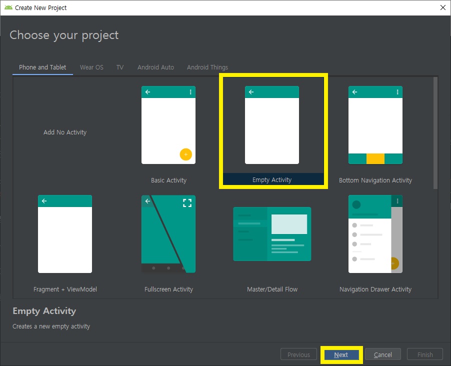 프로젝트 만드는 과정과 안드로이드 가상 기기를 만들어 시뮬레이션하는 화면을 순서대로 캡처하여 올립니다. 화면 캡처가 많아서 길어지므로 자세한 코딩 내용과 간단한 해설은 다음 글에 올릴 예정입니다.